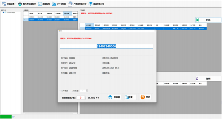 (3)客户端主要用于配料、称重、打印标签,手机端主要用于生产下料的数据校验和生产报工