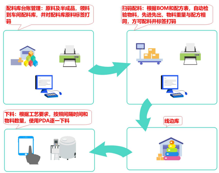 (1)从仓库领料到车间后,分为中转库与线边库,分别对应配料与生产,系统无缝融合电子秤,达到配料要求方可配料并转到线边库,生产时使用PDA扫码进行物料校验,从而形成数据的闭环